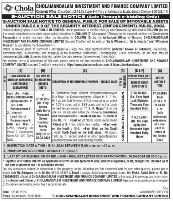 | Start Date and Time of Auction: | 17-04-2024 2:00 pm |