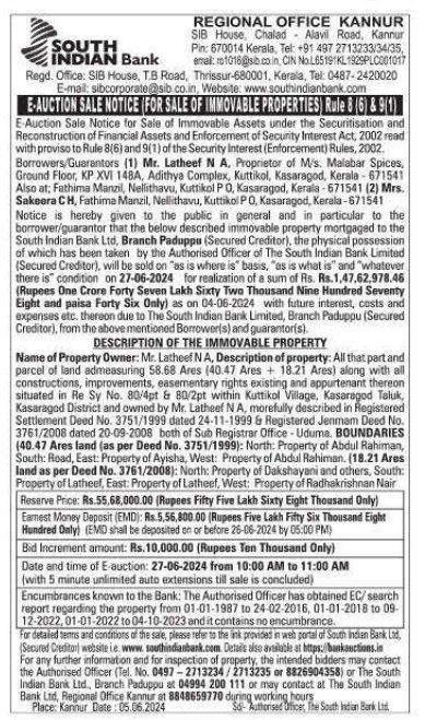 | Schedule of Property: | All that part and parcel of land admeasuring 58.68 Ares (40.47 Ares 18.21 Ares) along with all constructions, improvements, easementary rights existing and appurtenant thereon situated in Re Sy No. 80/4pt and 80/2pt within Kuttikol Village, Kasaragod Taluk, Kasaragod District and owned by Mr. Latheef NA, morefully described in Registered Settlement Deed No. 3751\ 1999 dated 24-11-1999 and Registered Jenmam Deed No. 3761\2008 dated 20-09-2008 both of Sub Registrar Office - Uduma BOUNDARIES (40.47 Ares land (as per Deed No. 3751/1999): North: Property of Abdul Rahiman, South: Road, East: Property of Ayisha, West: Property of Abdul Rahiman. (18.21 Ares land as per Deed No. 3761/2008): North: Property of Dakshayani and others, South: Property of Latheef, East: Property of Latheef, West: Property of Radhakrishnan Nair |