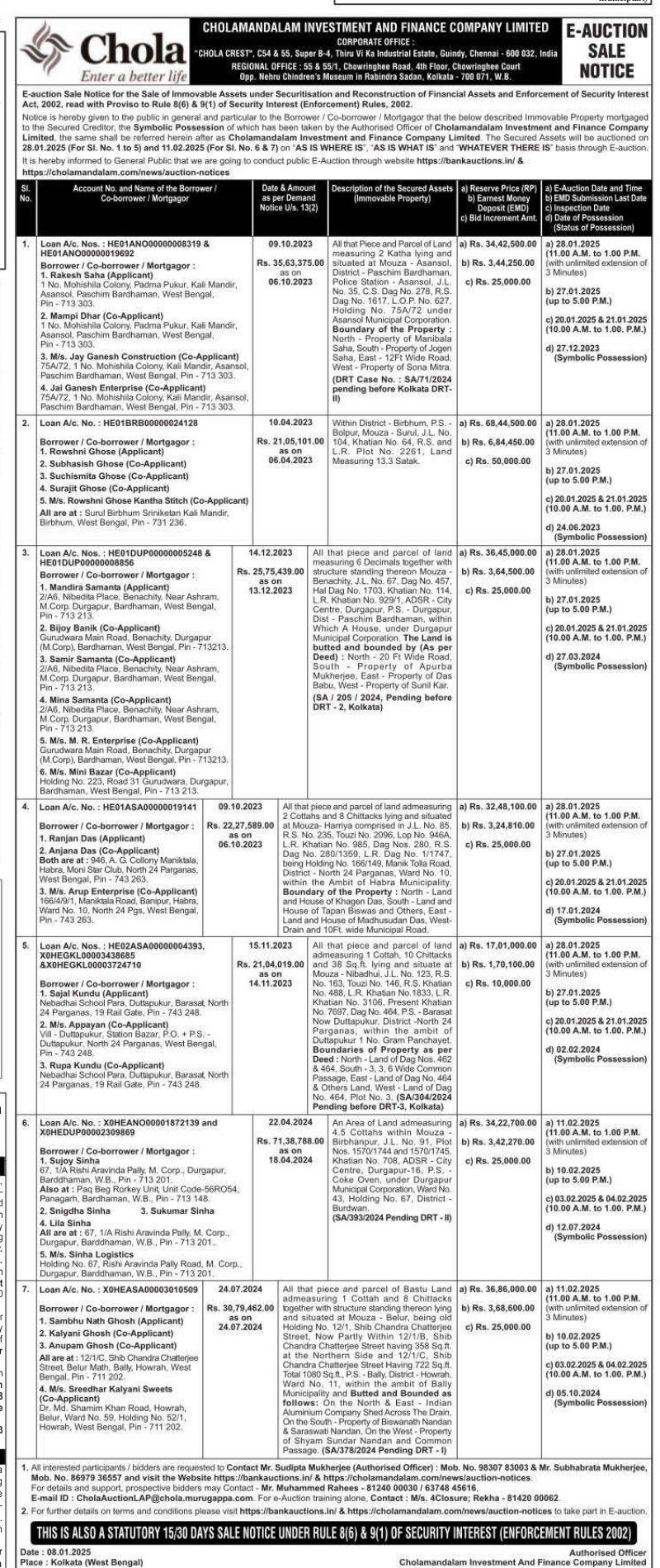 | Contact Details: | Contact The Authorized Officer : Mr. Sudipta Mukherjee - 9830783003, Mr. Subhabrata Mukherjee - 8697936557, Mr. Muhammed Rahees - 8124000030, 6374845616 |