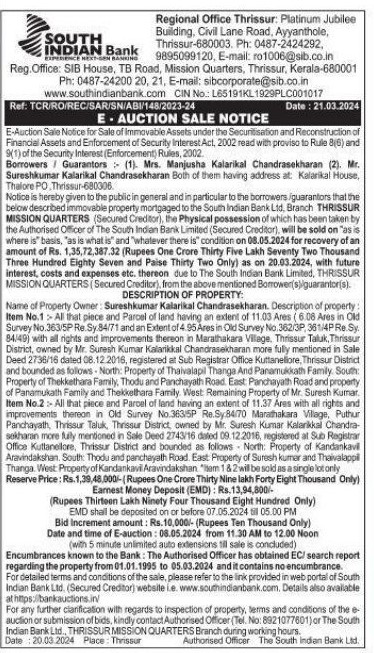 | Schedule of Property: | All that piece and Parcel of land having an extent of 11.03 Ares (6.06 Ares in Old Survey 84/71 and an Extent of 4.95 Ares in Old Survey No.362 with all rights and improvements thereon in Marathakara Village, Thrissur Taluk, Thrissur District, owned by Mr. Suresh Kumar Kalarikkal Chandrasekharan more fully mentioned in Sale Deed 2736/16 6 registered at Sub Registrar Office Kuttanellore Thrissur District and bounded as follows North Property of Thaivalapil Thanga And Panamukkath Family South: Property of Thekkethara Family. Thodu and Panchayath Road East Panchayath Road and property of Panamukath Family and Thekkethara Family West Remaining Property of Mr. Suresh Kumar. Item No.2- All that piece and Parcel of land having an extent of 11.37 Ares with all rights and improvements thereon in Old Survey No 36355 Re.Sy.84/70 Marathakara Village, Puthur Panchayath Thrissur Taluk Thrissur District owned by Mr. Suresh Kumar Kalarikkai Chandra- sekharan more fully mentioned in Sale Deed 2743 registered at Sub Registrar Office Kuttanellore, Thrissur District and bounded as follows - North: Property of Kandankavil Aravindakshan South Thodu and panchayath Road East Property of Suresh kumar and Thaivalappil Thanga West Property of Kandankavi Aravindakshan item 1 amp;2 will be sold as a single lot only |