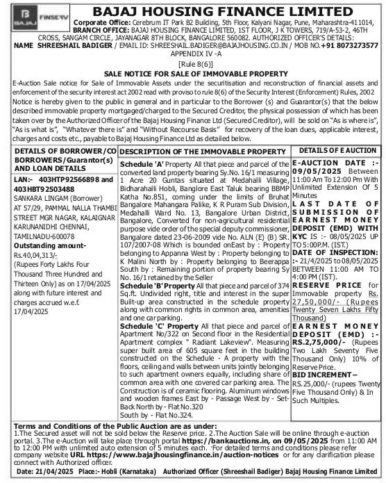 | End Date and Time of Auction: | 09-05-2025 12:00 pm |