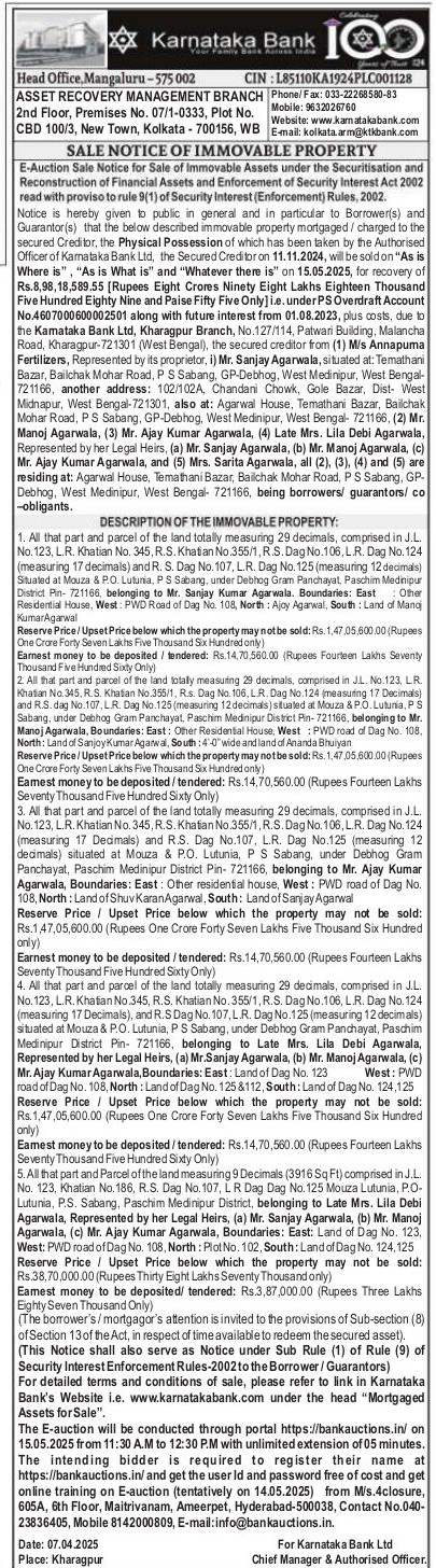 | Schedule of Property: | 2. All that part and parcel of the land totally measuring 29 decimals, comprised in J.L. No.123, LR. Khatian No. 345, R.S. Khatian No.355/1, R.s. Dag No. 106, L.R. Dag No.124 (measuring 17 Decimals) and R.S. dag No.107, L.R. Dag No.125 (measuring 12 decimals) situated at Mouza & P.O. Lutunia, P S Sabang, under Debhog Gram Panchayat, Paschim Medinipur District Pin-721166, belonging to Mr. Manoj Agarwala, Boundaries: East: Other Residential House, West: PWD road of Dag No. 108, North: Land of Sanjoy Kumar Agarwal, South: 4'-0" wide and land of Ananda Bhuiyan |