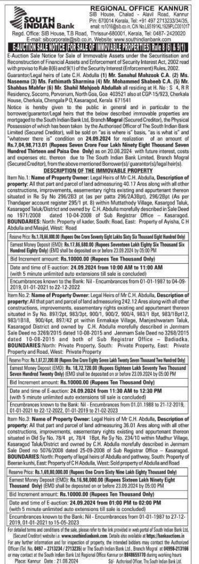 | Schedule of Property: | property: All that part and parcel of land admeasuring 40.17 Ares along with all other constructions, improvements, easementary rights existing and appurtenant thereon situated in Re Sy No 296/2B3 pt (as per patta 296/2A3Bpt), 296/2Bpt (As per Thandaper account register 295/1 pt. 8) within Muttathody Village, Kasargod Taluk, Kasaragod Taluk/District and owned by C.H. Abdulla morefully described in Sale Deed no 1971/2008 dated 10-04-2008 of Sub Registrar Office - Kasaragod BOUNDARIES: North: Property of kader, South: Road, East: Property of Ayisha, CH Abdulla and Masjid, West: Road |