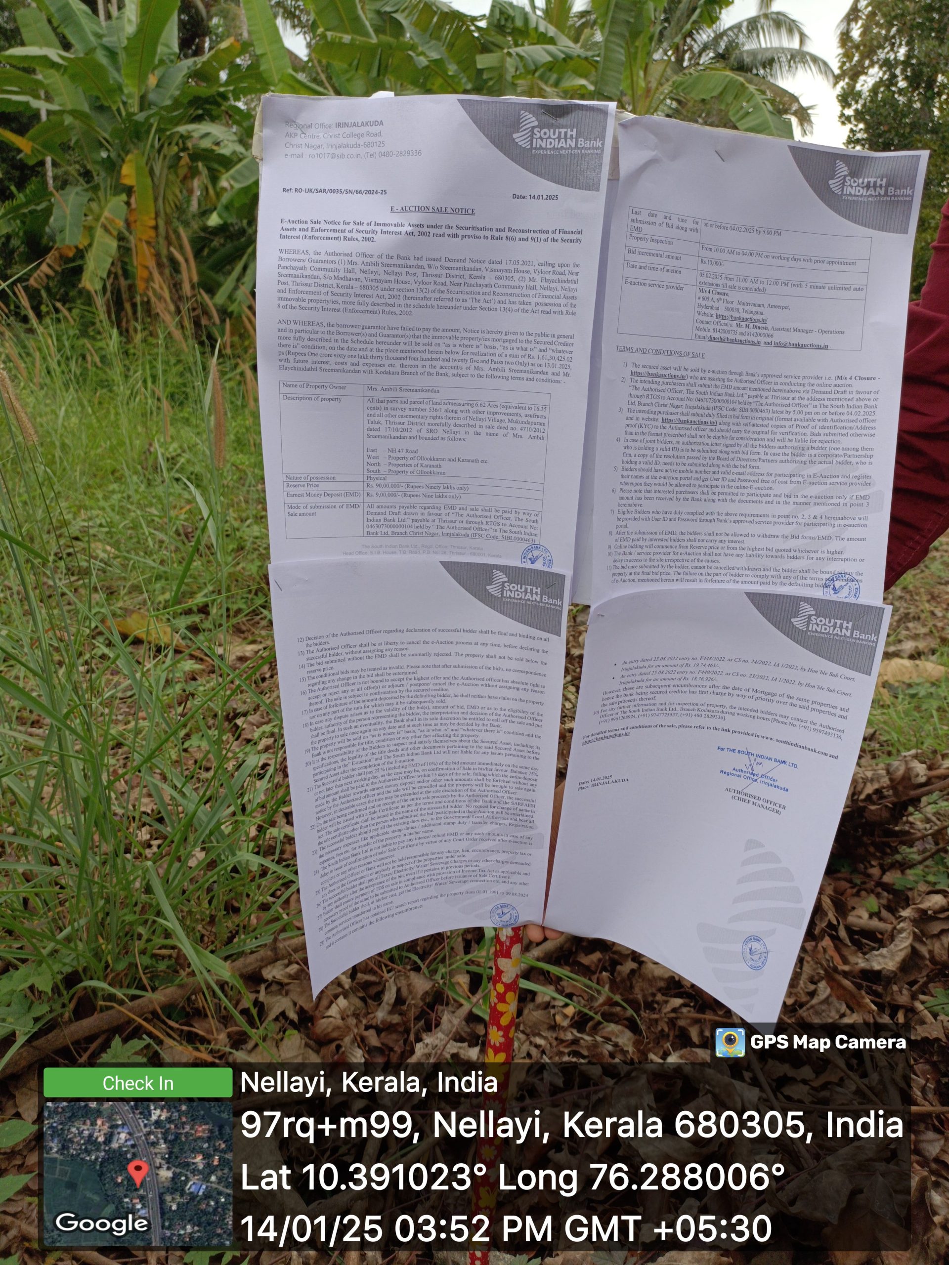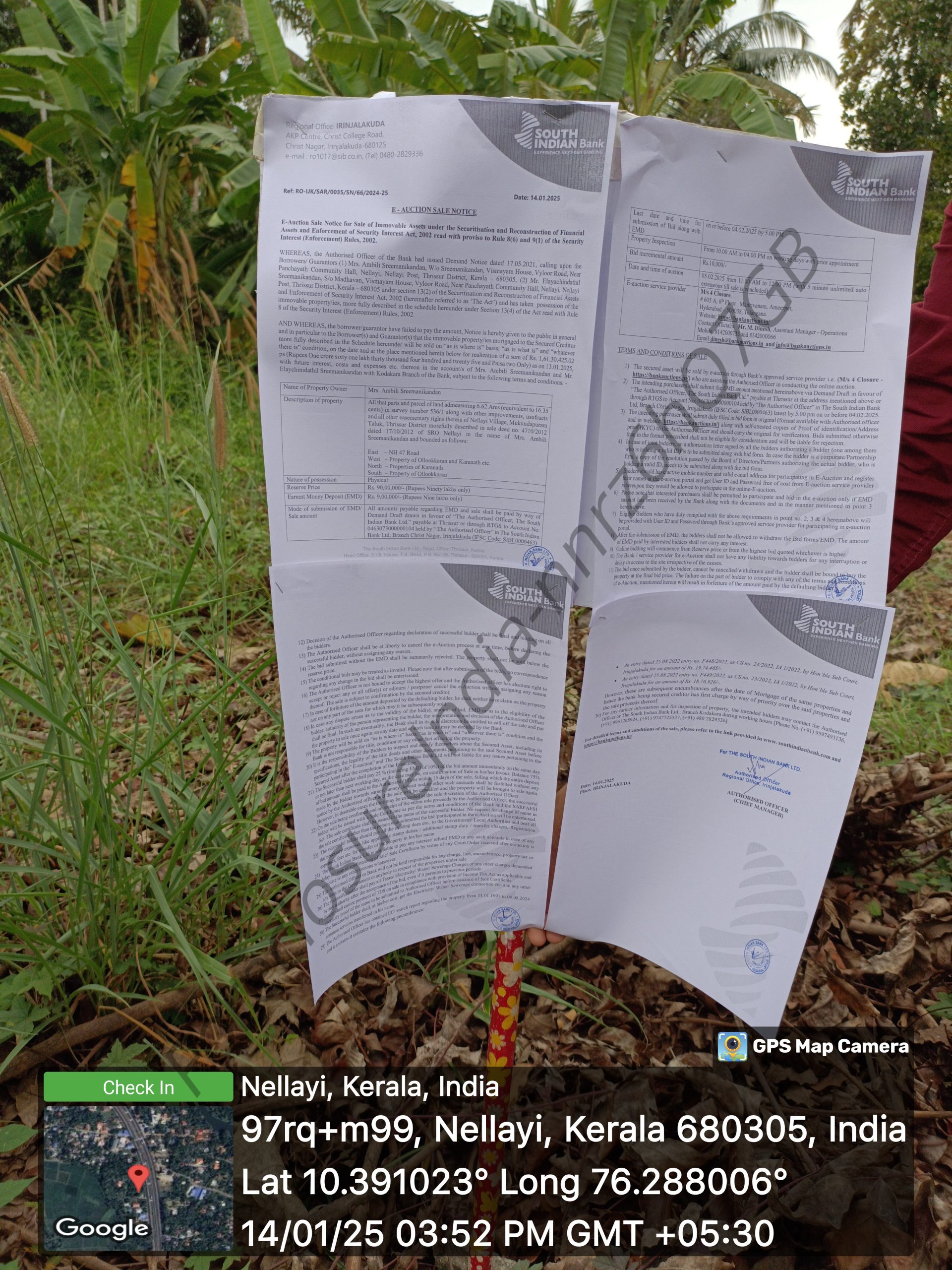 | Schedule of Property: | Description Of Property: All that parts and parcel of land admeasuring 6.62 Ares (equivalent to 16.35 cents) in survey number 536/1 along with other improvements, usufructs and all other easementary rights therein of Nellayi Village, Mukundapuram Taluk, Thrissur District morefully described in sale deed no. 4710/2012 dated 17/10/2012 of SRO Nellayi in the name of Mrs. Ambili Sreemanikandan. Bounded: East: NH 47 Road; West: Property of Ollookkaran and Karanath etc.; North: Properties of Karanath; South: Property of Ollookkaran |