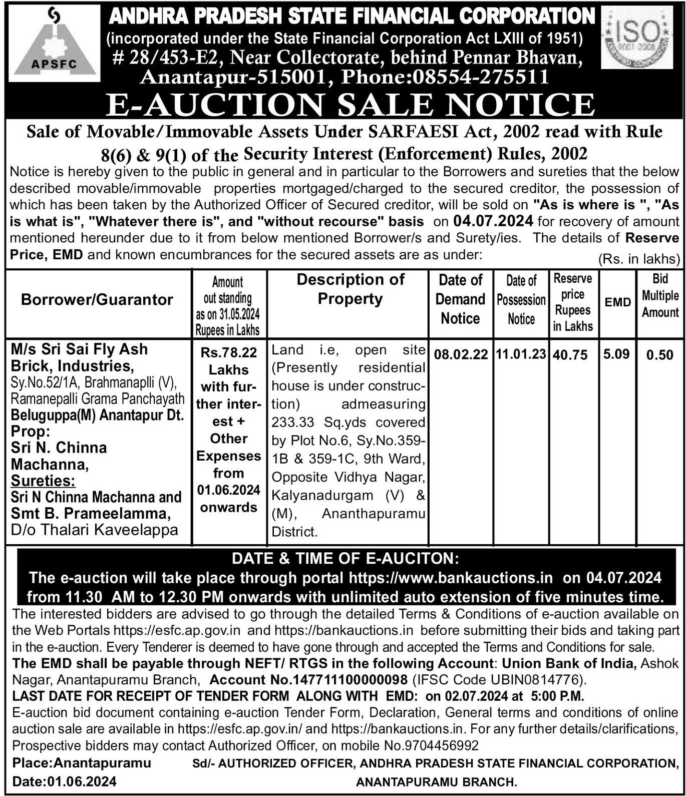 | Start Date and Time of Auction: | 04-07-2024 11:30 am |
