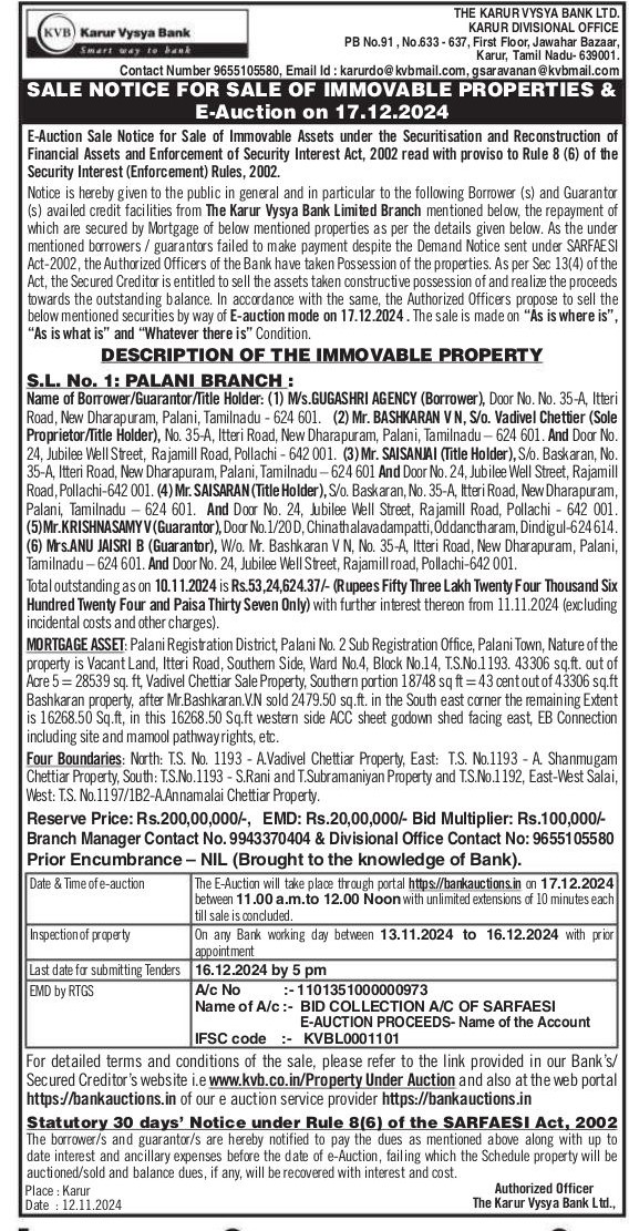 | End Date and Time of Auction: | 17-12-2024 4:00 pm |