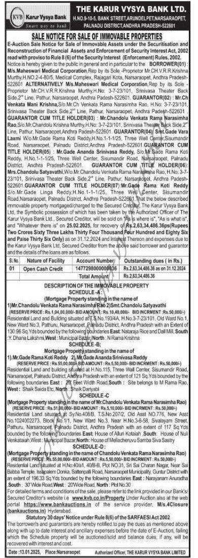 | Contact Details: | Contact Authorized Officer Mobile No.:9959988580, Branch Manager - Mr.N.Koteswara Rao Phone: 9959077111, Email: narasaraopet@kvbmail.com |