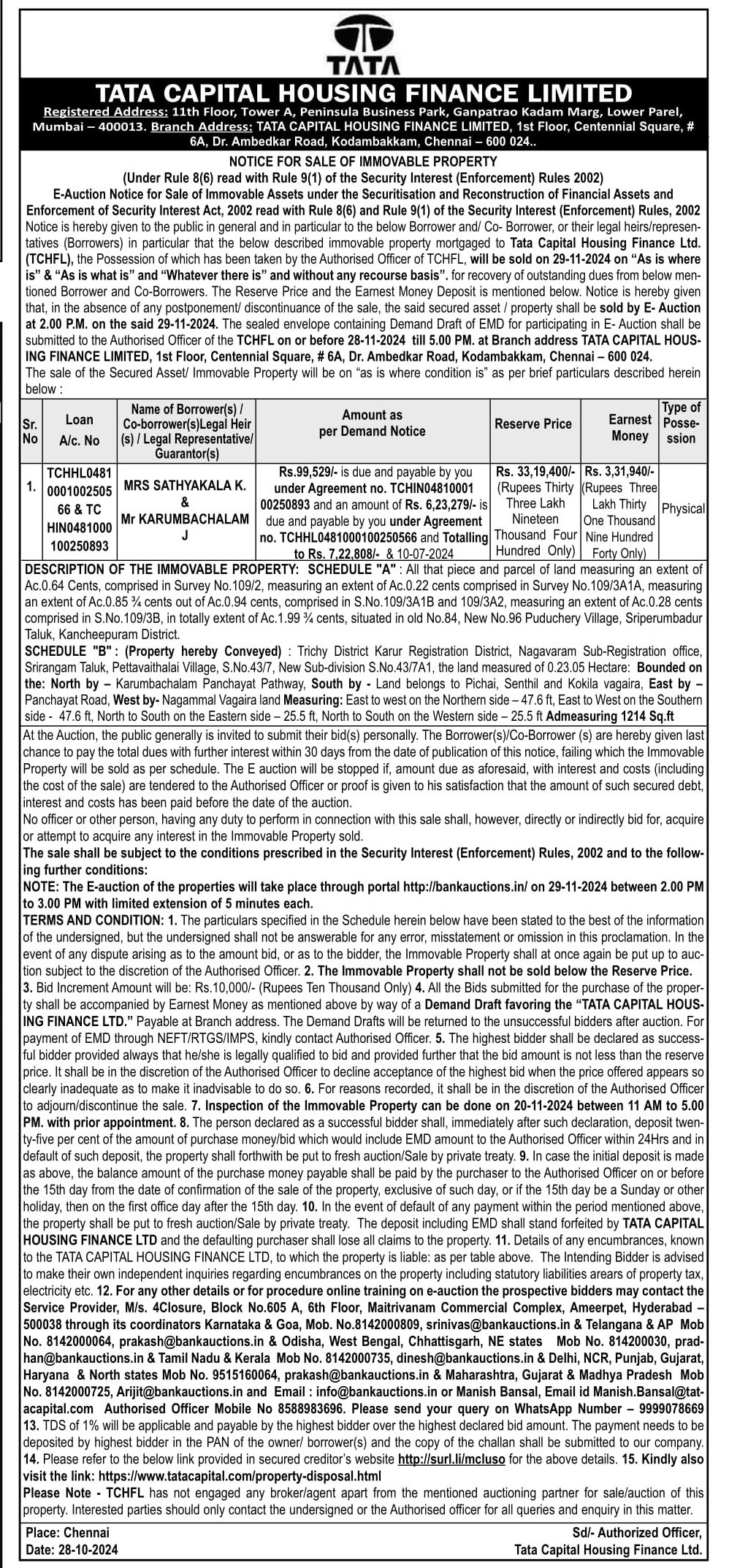 | Contact Details: | Contact the Authorized Officer : Mr. Manish Bansal - 8588983696 / 9999078669, Email: manish.bansal@tatacapital.com |