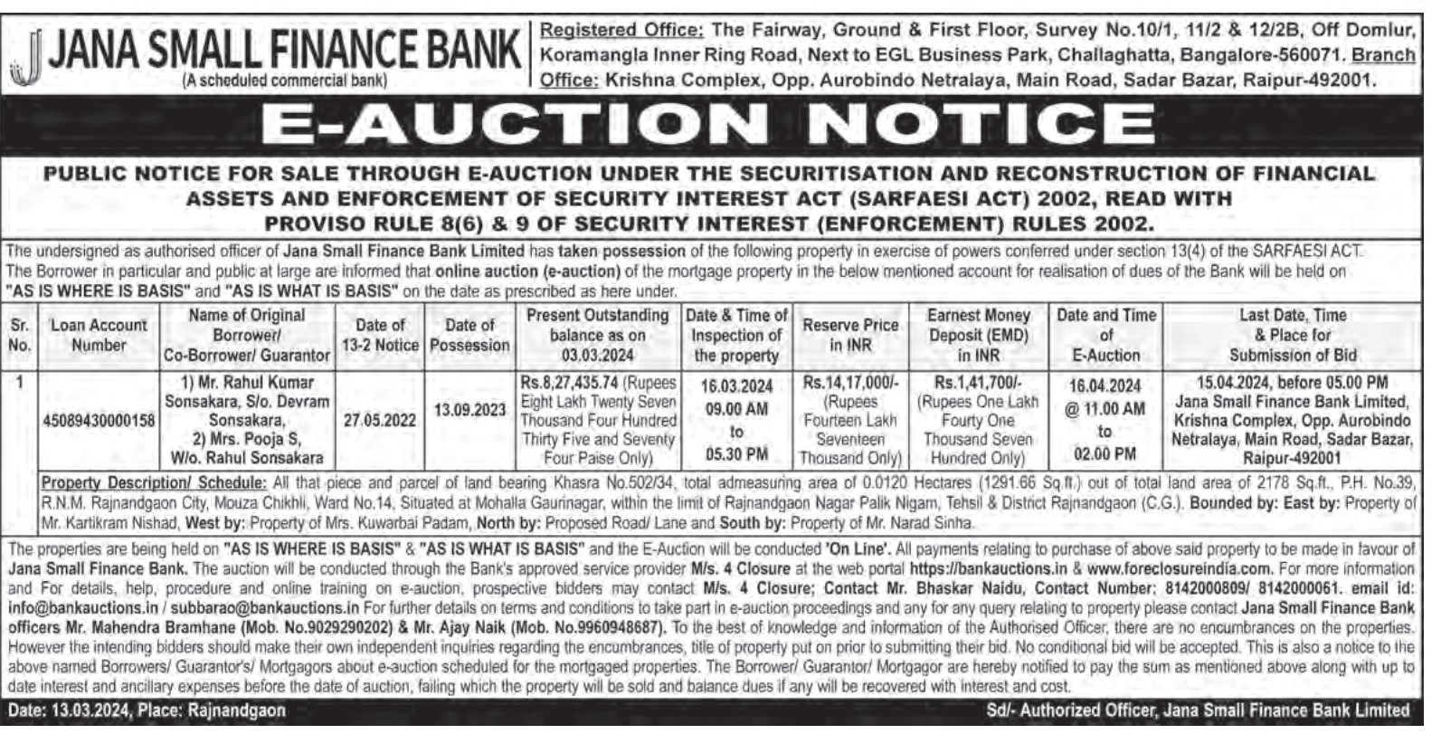 | Schedule of Property: | Property Description/ Schedule: All that piece and parcel of land bearing Khasra No.502/34, total admeasuring area of 0.0120 Hectares (1291.66 Sq.ft.) out of total land area of 2178 Sq.ft., R.N.M. Rajnandgaon City, Mouza Chikhli, Ward No.14. Situated at Mohalla Gaurinagar, within the limit of Rajnandgaon Nagar Palik Nigam, Tehsil & District Rajnandgaon (C.G.). Bounded by: East by: Property of Mr. Kartikram Nishad, West by: Property of Mrs. Kuwarbai Padam, North by: Proposed Road/ Lane and South by: Property of Mr. Narad Sinha. |
