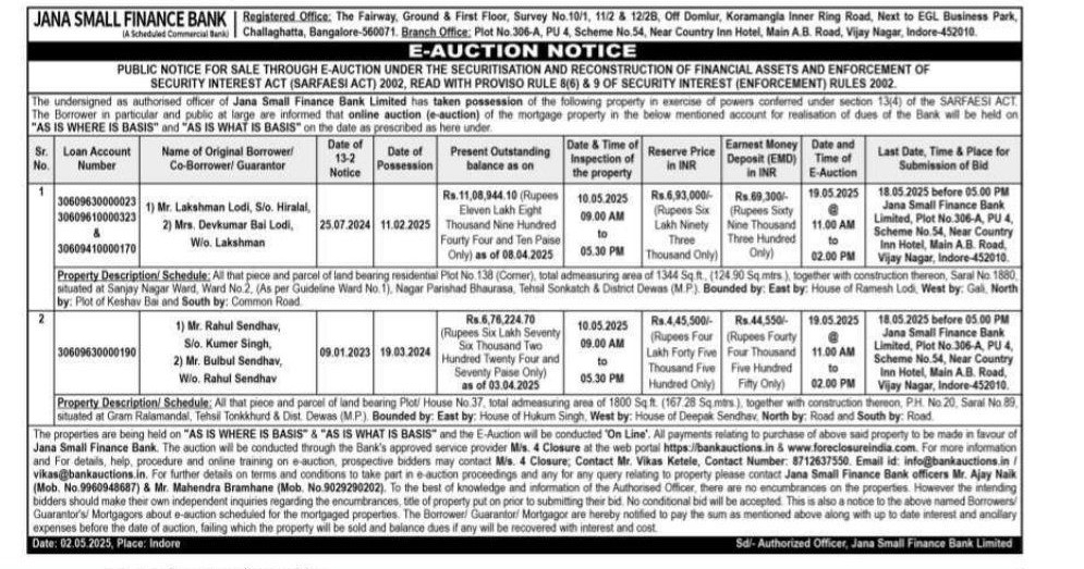 | Schedule of Property: | Property Description/Schedule: All that piece and parcel of land bearing residential Plot No. 138 (Comer), total admeasuring area of 1344 Sq.ft., (124.90 Sq mtrs), together with construction thereon, Saral No 1880, situated at Sanjay Nagar Ward, Ward No.2. (As per Guideline Ward No. 1), Nagar Parishad Bhaurasa, Tehsil Sonkatch & District Dewas (M.P) Bounded by: East by: House of Ramesh Lodi, West by: Gail, North by: Plot of Keshav Bai and South by: Common Road |