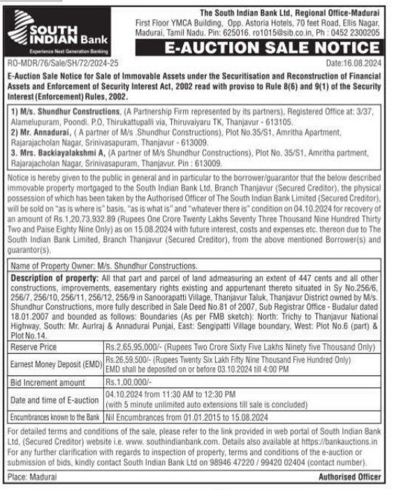 | Schedule of Property: | Description of property: All that part and parcel of land admeasuring an extent of 447 cents and all other constructions, improvements easementary rights existing and appurtenant thereto situated in Sy No 256/6. 256/7.256/10.256/11. 256/12, 256/9 in Sanoorapatti Village, Thanjavur Taluk Thanjavur District owned by M/s. Shundhur Constructions, more fully described in Sale Deed No.81 of 2007, Sub Registrar Office . Budalur dated 18.01.2007 and bounded as follows: Boundaries (As per FMB sketch): North: Trichy to Thanjavur National Highway South: Mr. Aurtraj & Annadurai Punjai, East: Sengipatti Village boundary. West: Plot No.6 (part) & Plot No.14 |