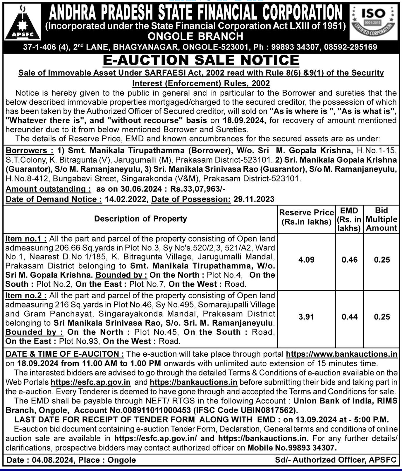 | End Date and Time of Auction: | 18-09-2024 1:00 pm |