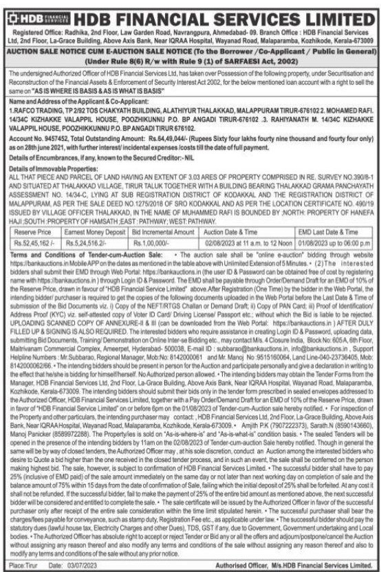 | Inspection Details: | For Inspection Details Contact The Authorized Officer: Manoj Panicker (8589972288), Amith 7907222373, Sarath N 8590143660 |