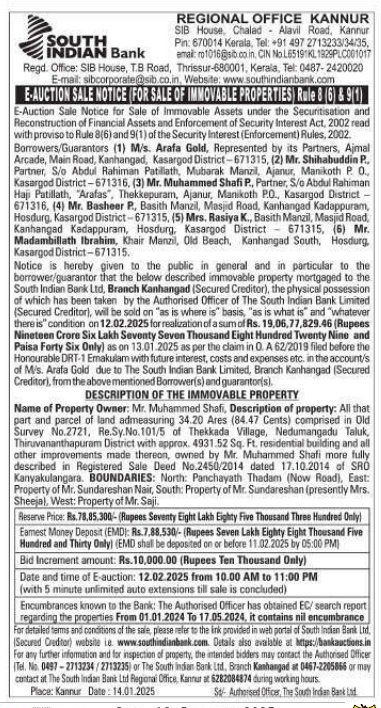 | Schedule of Property: | Name of Property Owner: Mr. Muhammed Shafi, Description of property: All that part and parcel of land admeasuring 34.20 Ares (84.47 Cents) comprised in Old Survey No.2721, Re.Sy.No.101/5 of Thekkada Village, Nedumangadu Taluk, Thiruvananthapuram District with approx. 4931.52 Sq. Ft. residential building and all other improvements made thereon, owned by Mr. Muhammed Shafi more fully described in Registered Sale Deed No.2450/2014 dated 17.10.2014 of SRO Kanyakulangara. BOUNDARIES: North: Panchayath Thadam (Now Road), East: Property of Mr. Sundareshan Nair, South: Property of Mr. Sundareshan (presently Mrs. Sheeja), West: Property of Mr. Saji. |