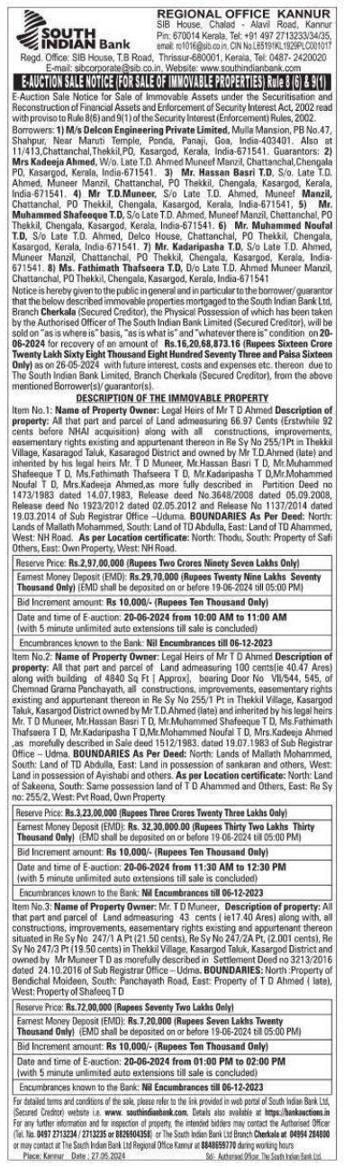 | Schedule of Property: | All that part and parcel of Land admeasuring 43 cents I e17.40 Ares) along with all constructions, improvements, easementary rights existing and appurtenant thereon situated in Re Sy No 247/1 (21.50 cents). Re Sy No 247/2APt, (2.001 cents), Re Sy No 247/3 cents) in Thekkil Village, Kasargod Taluk, Kasargod District and owned by Mr Muneer TD as morefully described in Settlement Deed no 3213/2016 dated 24.10.2016 of Sub Registrar Office Udma. BOUNDARIES: North Property of Bendichal Moideen, South: Panchayath Road, East Property of TO Ahmed ( late), West: Property of Shafeeq TD |