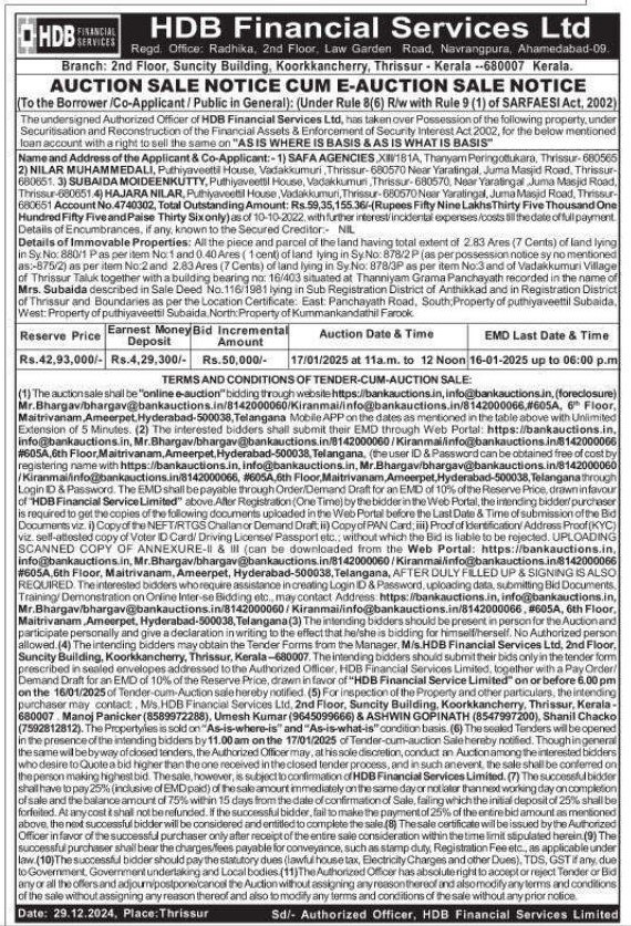 | Contact Details: | Contact the Authorized Officer : Manoj Panicker 8589972288 , Umesh Kumar 9645099666 , ASHWIN GOPINATH 8547997200 , Shanil Chacko 7592812812 |