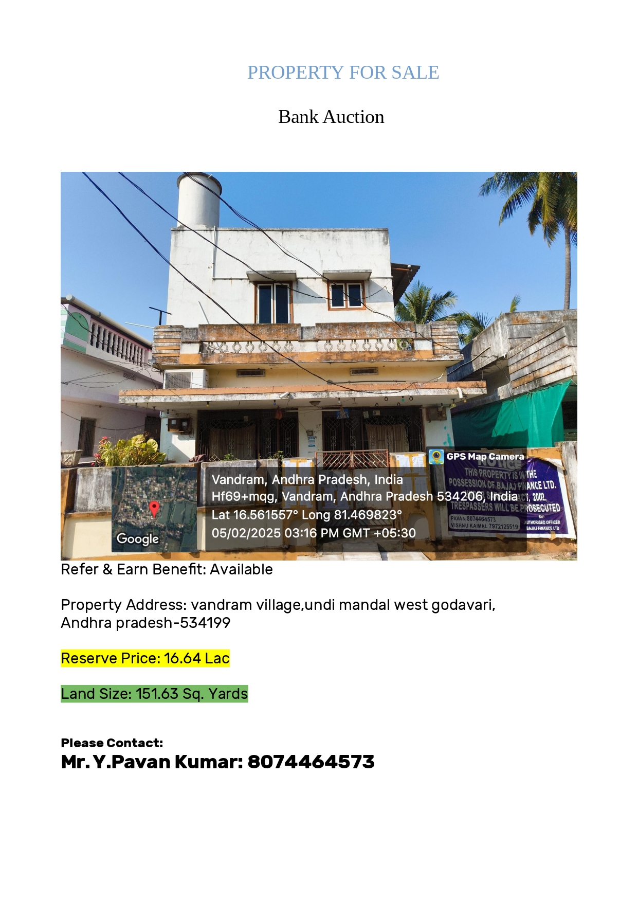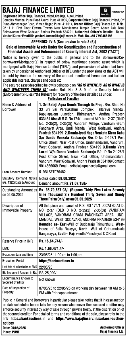 | Contact Details: | Contact the Authorized Officer : Yenduri Kumar Mob. No. +917799468198 |