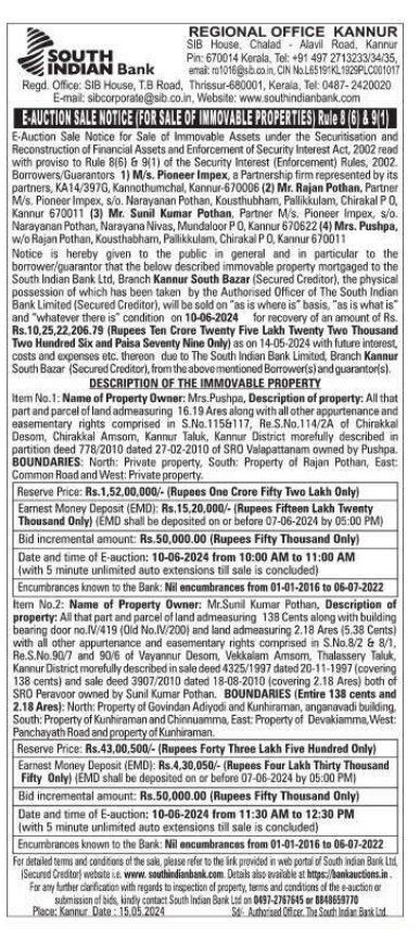 | Schedule of Property: | Item No.2: Name of Property Owner: Mr Sunil Kumar Pothan, Description of property: All that part and parcel of land admeasuring 138 Cents along with building bearing door no IV/419 (Old No.IV/200 and land admeasuring 2.18 Ares (5.38 Cents) with all other appurtenance and easementary rights comprised in S.No.8/2 & 8/1, Re.S.No.90/7 and 90/6 of Vayannur Desom. Vekkalam Amsom Thalassery Taluk Kannur District morefully described in sale deed 4325/1997 dated 20-11-1997 (covering 138 cents) and sale deed 3907/2010 dated 18-08-2010 (covering 2.18 Ares) both of SRO Peravoor owned by Sunil Kumar Pothan BOUNDARIES (Entire 138 cents and 2.18 Ares): North: Property of Govindan Adiyodi and Kunhiraman, anganavadi building South: Property of Kunhiraman and Chinnuamma, East Property of Devakiamma West Panchayath Road and property of Kunhiraman |