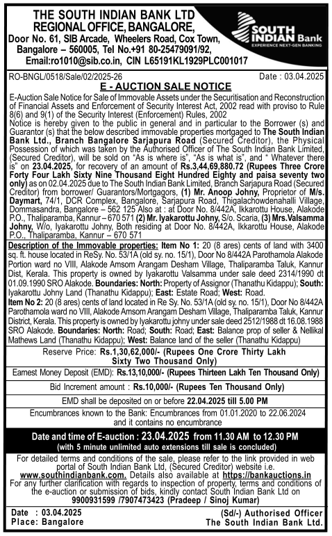 | Schedule of Property: | Description of the Immovable properties: Item No 1: 20 (8 ares) cents of land with 3400 sq. ft. house located in ReSy. No. 53/1A (old sy. no. 15/1), Door No 8/442A Parothamola Alakode Portion ward no VIII, Alakode Amsom Arangam Desham Village, Thaliparamba Taluk, Kannur Dist, Kerala. This property is owned by lyakarottu Valsamma under sale deed 2314/1990 dt 01.09.1990 SRO Alakode. Boundaries: North: Property of Assignor (Thanathu Kidappu); South: lyakarottu Johny Land (Thanathu Kidappu); East: Estate Road, West: Road. Item No 2: 20 (8 ares) cents of land located in Re Sy. No. 53/1A (old sy. no. 15/1), Door No 8/442A Parothamola ward no VIII, Alakode Amsom Arangam Desham Village, Thaliparamba Taluk, Kannur District, Kerala. This property is owned by lyakarottu johny under sale deed 2512/1988 dt 16.08.1988 SRO Alakode. Boundaries: North: Road; South: Road; East: Balance prop of seller & Nellikal Mathews Land (Thanathu Kidappu); West: Balance land of the seller (Thanathu Kidappu) |