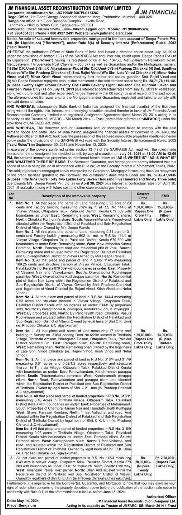 | Schedule of Property: | 3. All that piece and parcel of landed properties in R.S. No. 116/4 measuring 0.40 acre in Vilayur Village, Ottapalam Taluk, Palakkad District, Kerala 679 309 with boundaries as under: East: Muthalakuzhi Nilam South: Path way West: Kolangare Pallyal Kozhipallyal North: Ohari And situated within the Registration District of Palakkad and Sub Registration District of Vilayur. Owned by legal heirs of Late Shri. C.K. Unni (i.e. Pradeep Chirakal and C Vijayakumari) |