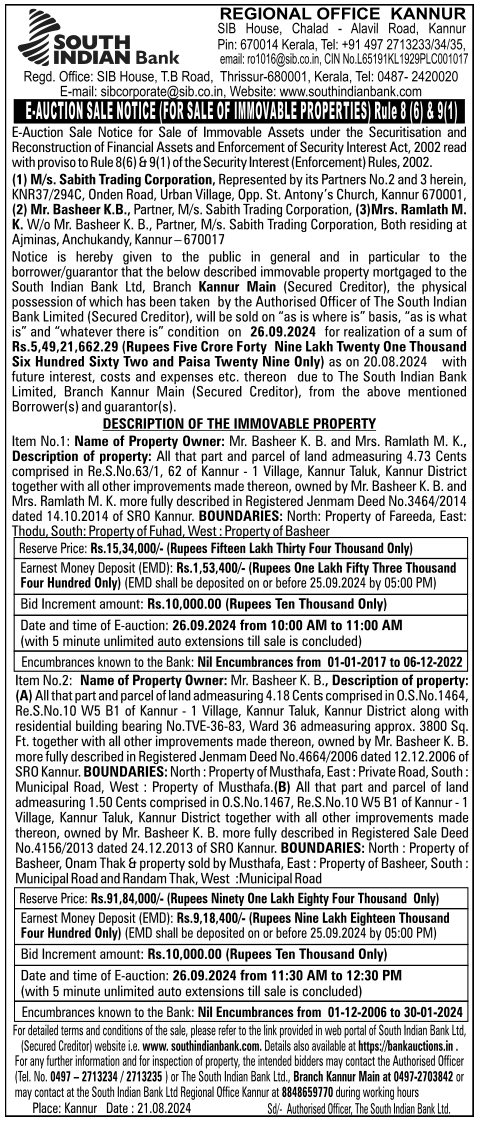 | Schedule of Property: | Item No.1: All that part and parcel of land admeasuring 4.73 Cents comprised in Re.S.No.63/1, 62 of Kannur 1 Village, Kannur Taluk, Kannur District - together with all other improvements made thereon, owned by Mr. Basheer K. B. and Mrs. Ramlath M. K. more fully described in Registered Jenmam Deed No.3464/2014 dated 14.10.2014 of SRO Kannur. BOUNDARIES: North: Property of Fareeda, East: Thodu, South: Property of Fuhad, West: Property of Basheer |