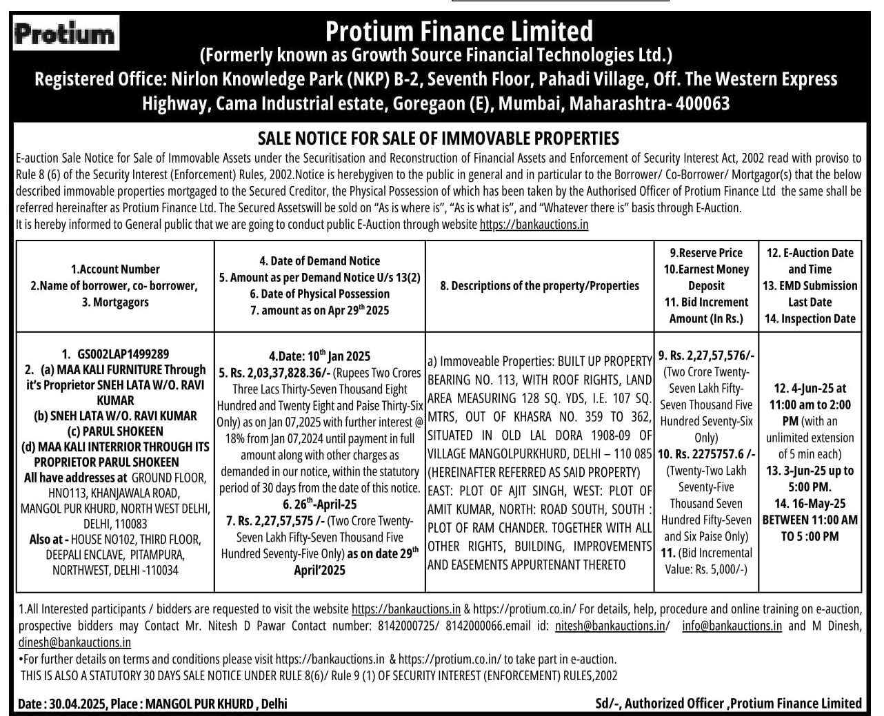 | Start Date and Time of Auction: | 04-06-2025 11:00 am |