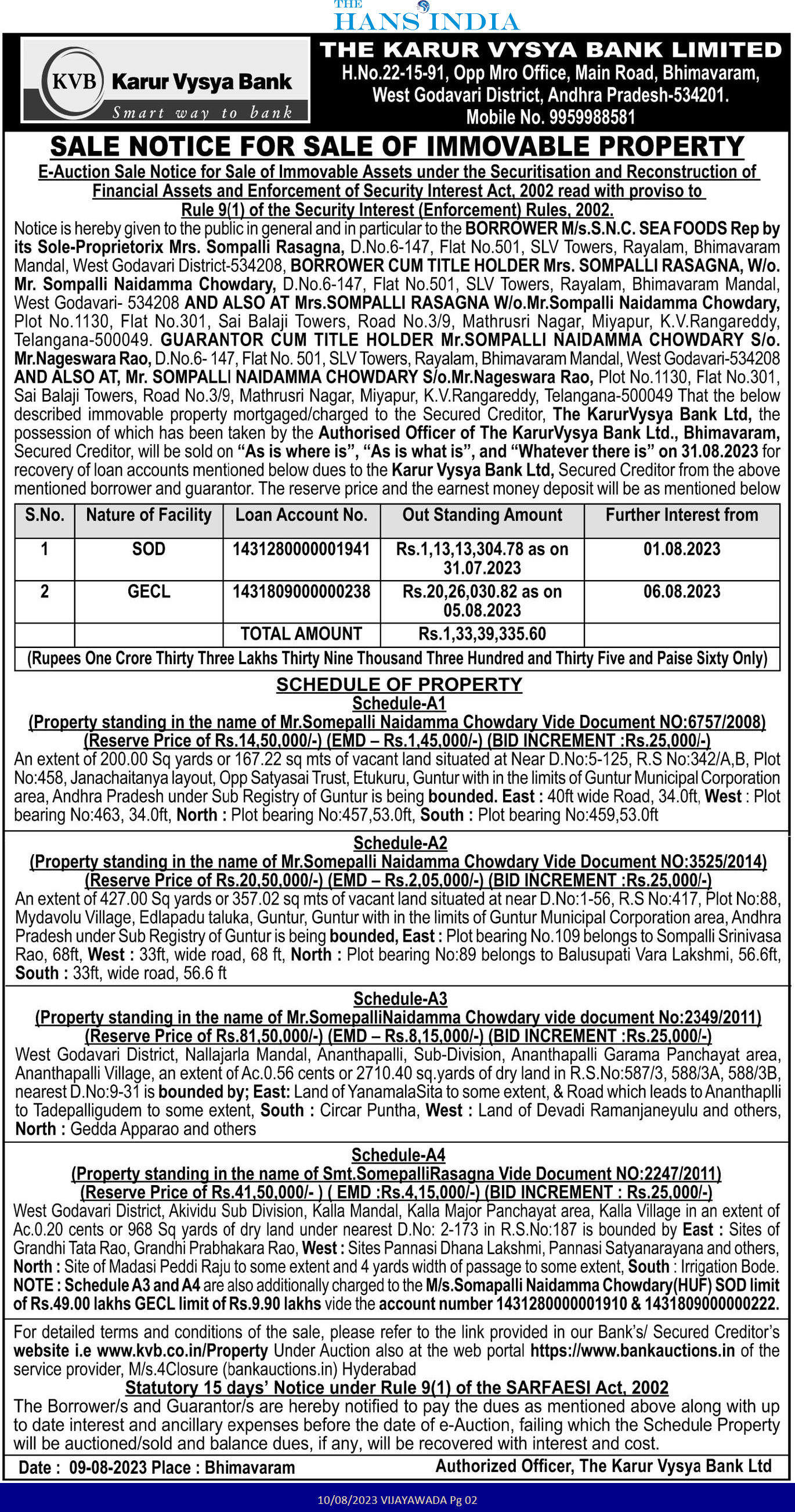 | Schedule of Property: | Schedule A4 - West Godavari District, Akividu Sub Division, Kalla Mandal, Kalla Major Panchayat area, Kalla Village in An extent of Ac.0.20 cents or 968 Sq yards of dry land under nearest D.No: 2-173 in R.S.No:18 is Bounded by East : Sites of Grandhi Tata Rao, Grandhi Prabhakara Rao, West: Sites Pannasi Dhana Lakshmi, Pannasi Satyanarayana and others, North : Site of Madasi Peddi Raju to some extent and 4 yards width of passage to some extent, South : Irrigation Bode. NOTE: Schedule A3 and A4 are also additionally charged to the M/s. Somapalli Naidamma Chowdary(HUF) SOD limit of Rs.49.00 lakhs GECL limit of Rs.9.90 lakhs vide the account number 1431280000001910 1431809000000222 |