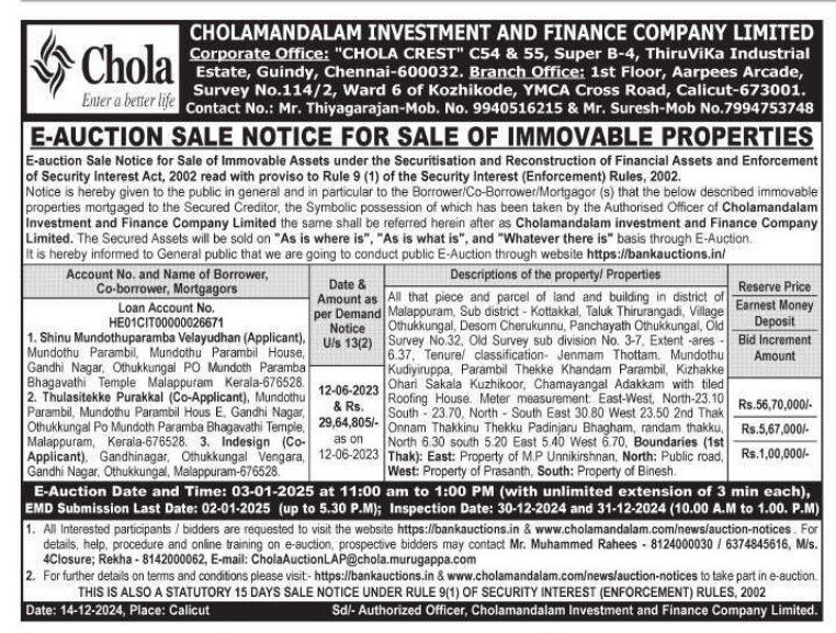 | Contact Details: | Contact The Authorized Officer: Mr. Thiyagarajan-Mob. No. 9940516215 & Mr. Suresh-Mob No.7994753748 Mr. Muhammed Rahees - 8124000030 |