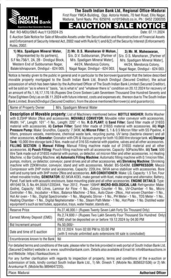 | Contact Details: | Contact The Authorized Officer: Mr. Dinesh T 8056531536, Mr. Arunkumar R 9894647220 |