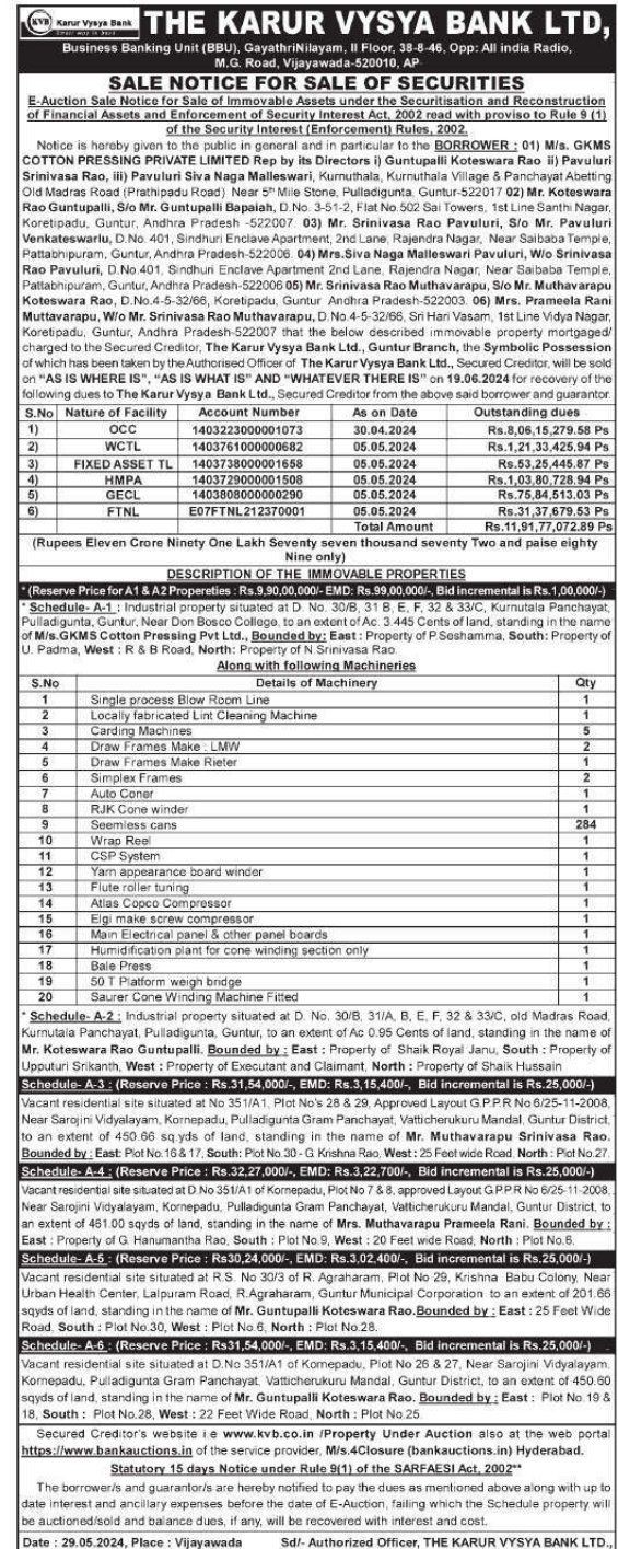 | Schedule of Property: | Schedule- A-1 Industrial property situated at D. No. 30/B, 31 E. F. 32 and 33/C, Kurnutala Panchayat, Pulladigunta, Guntur, Near Don Bosco College to an extent of Ac. 3.445 Cents of land, standing in the name of GKMS Cotton Pressing Pvt Ltd., Bounded by: East Property of P Seshamma. South: Property of U. Padma, West B Road, North: Property of N. Srinivasa Rao.Along with following MachineriesS. No Details of Machinery1 Single process Blow Room Line, Qty : 12 Locally fabricated Lint Cleaning Machine, : Qty : 13 Carding Machines QTY : 54 Draw Frames Make LMW Qty : 25 Draw Frames Make Rieter Qty : 16 Simplex Frames Qty : 27 Auto Coner Qty : 18 RJK Cone winder Qty : 19 Seemless cans Qty : 28410 Wrap Reel Qty : 111 CSP System Qty : 112 Yarn appearance board winder Qty : 113. Flute roller tuning Qty : 114. Atlas Copco Compressor Qty : 115. Elgi make screw compressor Qty : (Full details available in sale notice) |