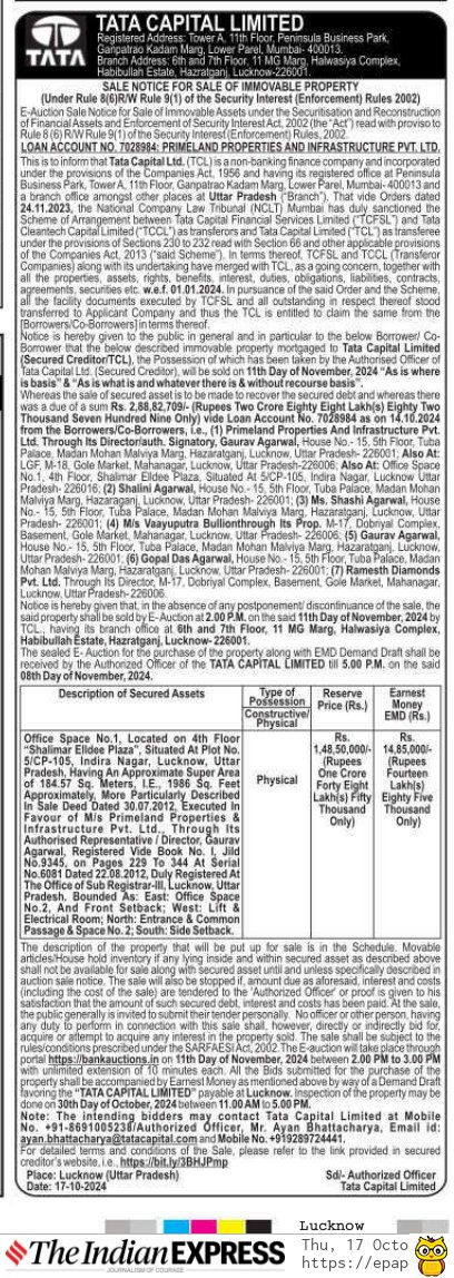 | Contact Details: | Contact The Authorized Officer: Mobile No. +91-8691005238 / Authorized Officer, Mr. Ayan Bhattacharya, Email id: ayan.bhattacharya@tatacapital.com and Mobile No. +91 9289724441. |