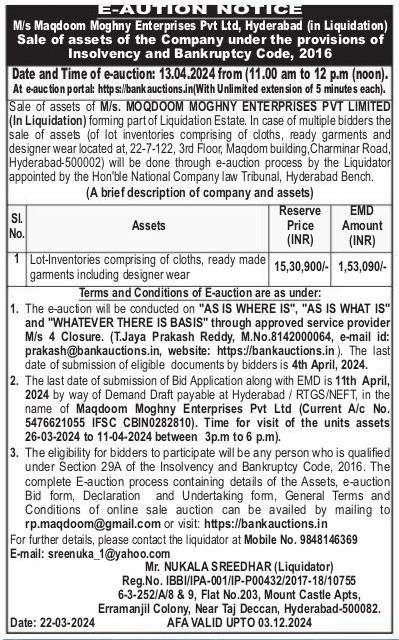 | End Date and Time of Auction: | 13-04-2024 12:00 pm |
