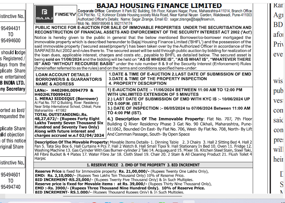 | Contact Details: | Contact The Authorized Officer: Sagar Zirange Ph No: Mob No. 8669189048 & 9921174174 |