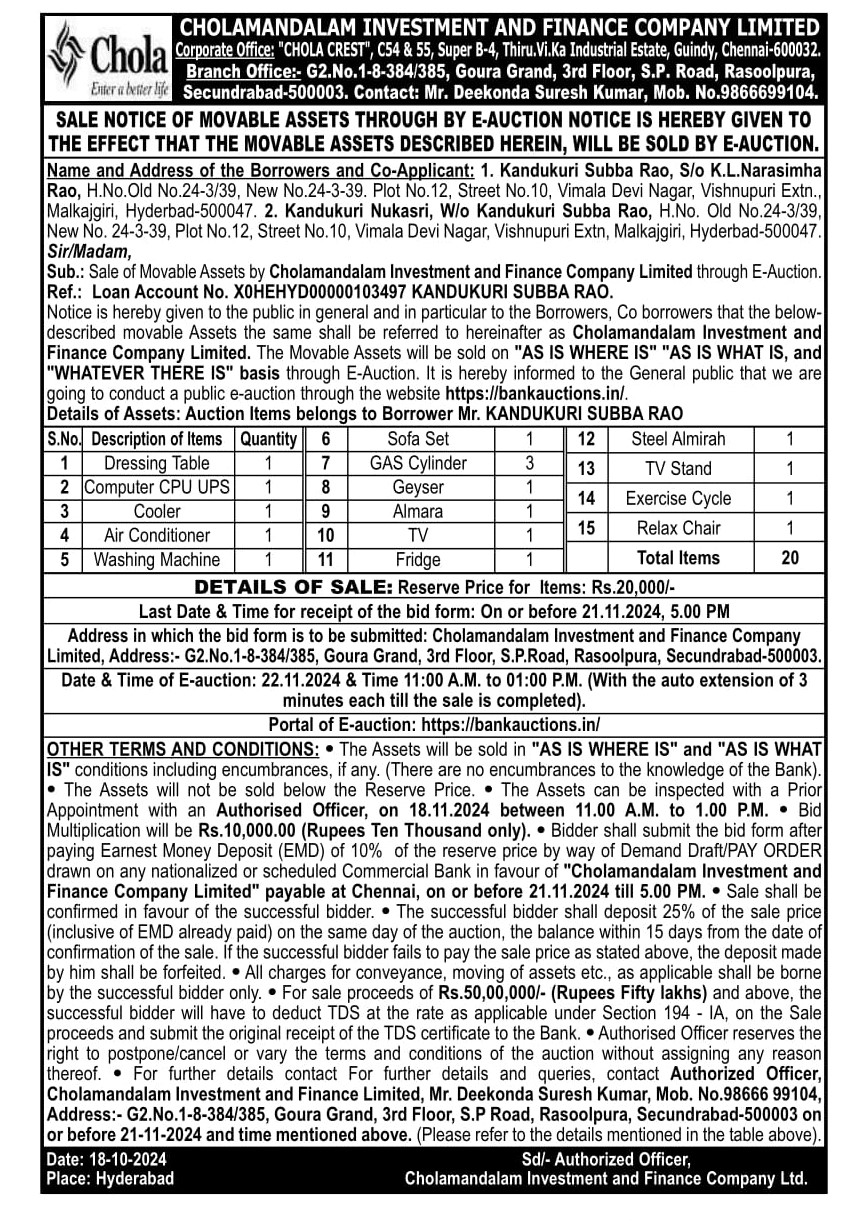 | Contact Details: | Contact The Authorized Officer : Mr. Deekonda Suresh Kumar - 9866699104, Mr. Muhammed Rahees - Ph.No.8124000030 |