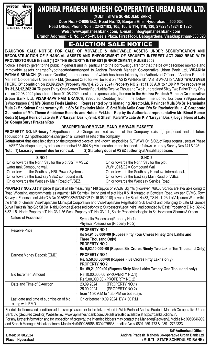 | Contact Details: | Contact The Authorized Officer: Mobile No 9490236056, 9394075538, 0891-2591173 & 0891-2752323. |