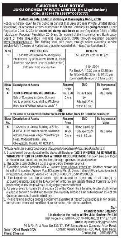| Property Details: | JUKU ORCHEM PRIVATE LIMITED- Sale of Company as Going Concern |