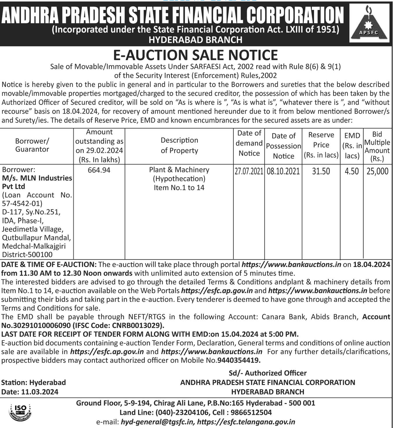 | Start Date and Time of Auction: | 18-04-2024 11:30 am |