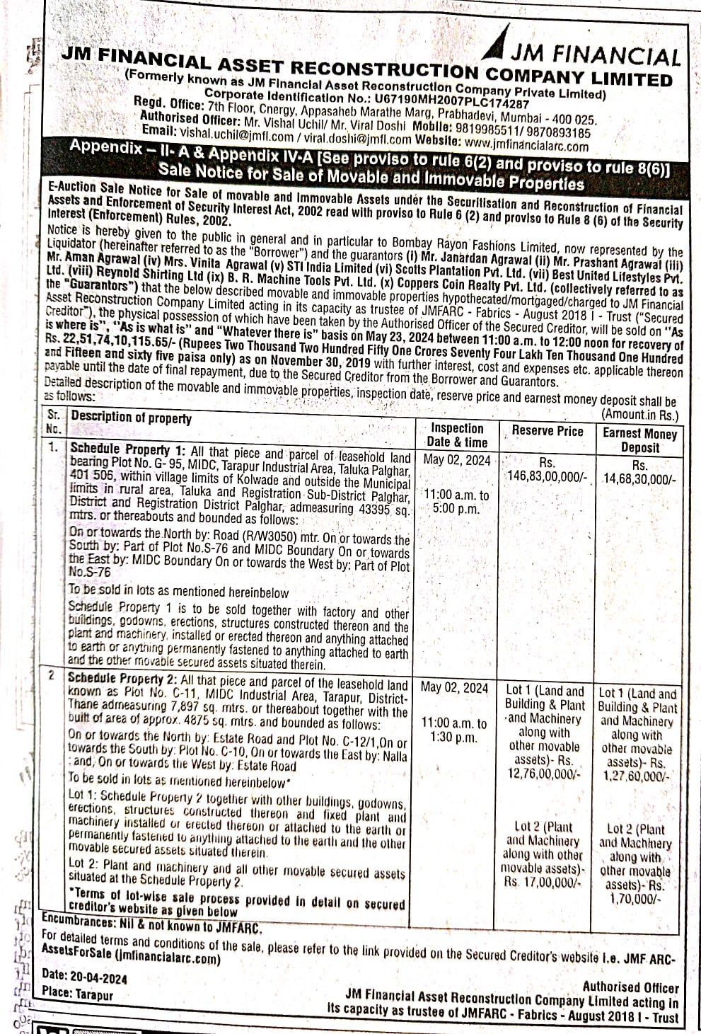 | Contact Details: | Contact The Authorised Officer: Mr. Vishal Uchil/ Mr. Viral Doshi Mobile: 9819985511/ 9870893185 Email: vishal.uchil@jmfl.com / viral.doshi@jmfl.com Website: www.jmfinancialarc.com |