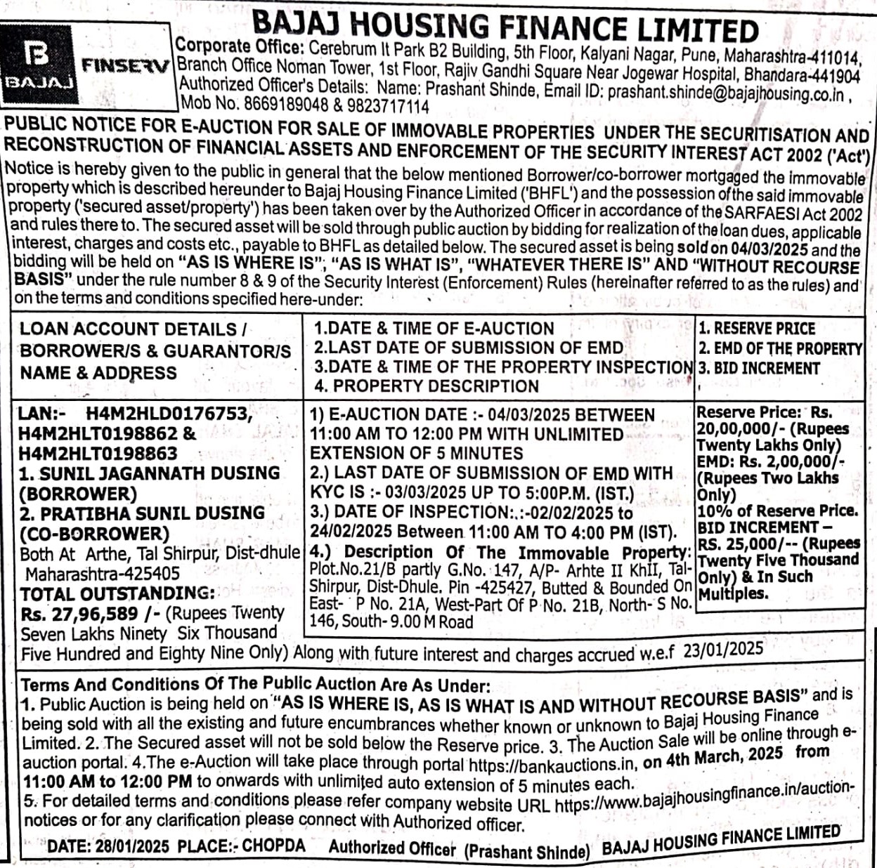 | Contact Details: | Contact the Authorized Officer : Prashant Shinde, Email ID: prashant.shinde@bajajhousing.co.in, Mob No. 8669189048 & 9823717114. |