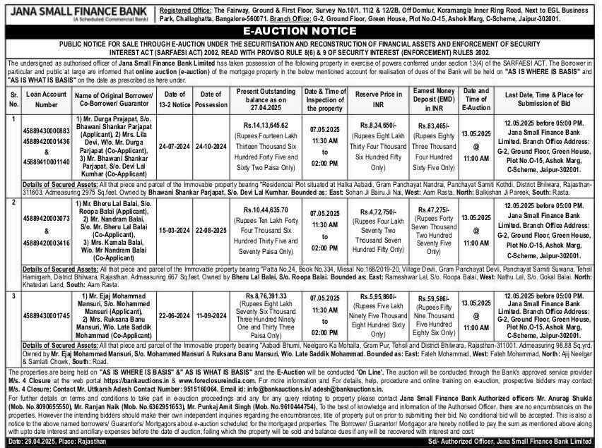 | End Date and Time of Auction: | 13-05-2025 12:00 pm |