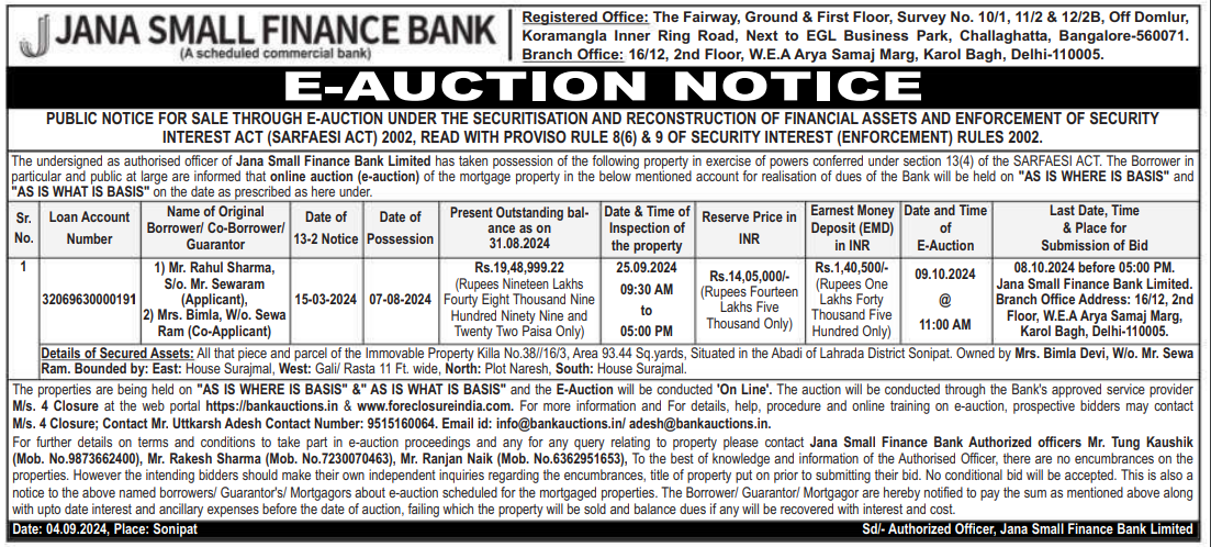 | Contact Details: | Contact The Authorized Officer: Mr. Tung Kaushik (Mob. No.9873662400), Mr. Rakesh Sharma (Mob. No.7230070463), Mr. Ranjan Naik (Mob. No.6362951653), |