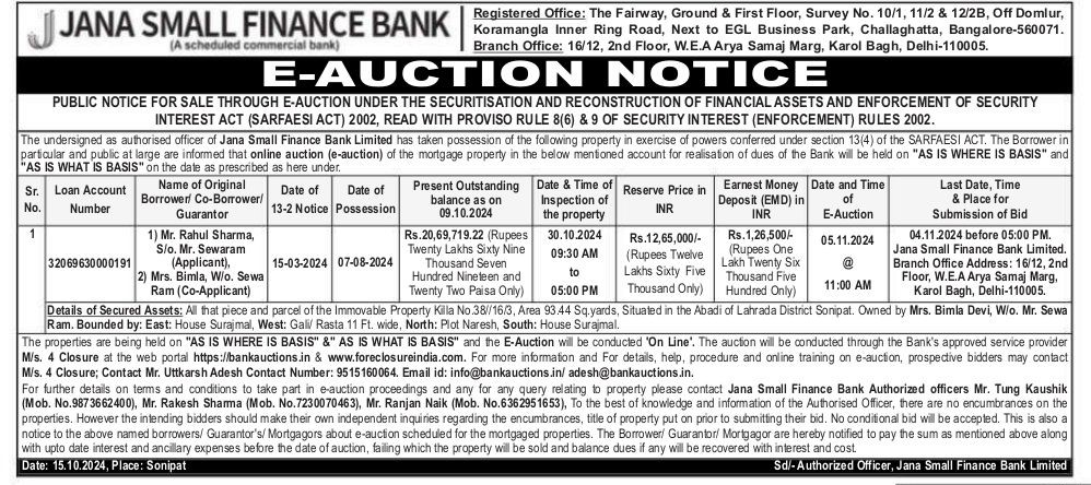 | Schedule of Property: | All that piece and parcel of the Immovable Property Killa No.38//16/3, Area 93.44 Sq.yards, Situated in the Abadi of Lahrada District Sonipat. Owned by Mrs. Bimia Devi, W/o. Mr. Sewa Ram. Bounded by: East: House Surajmal, West: Gal Rasta 11 Ft. wide, North: Plot Naresh, South: House Surajmal. |