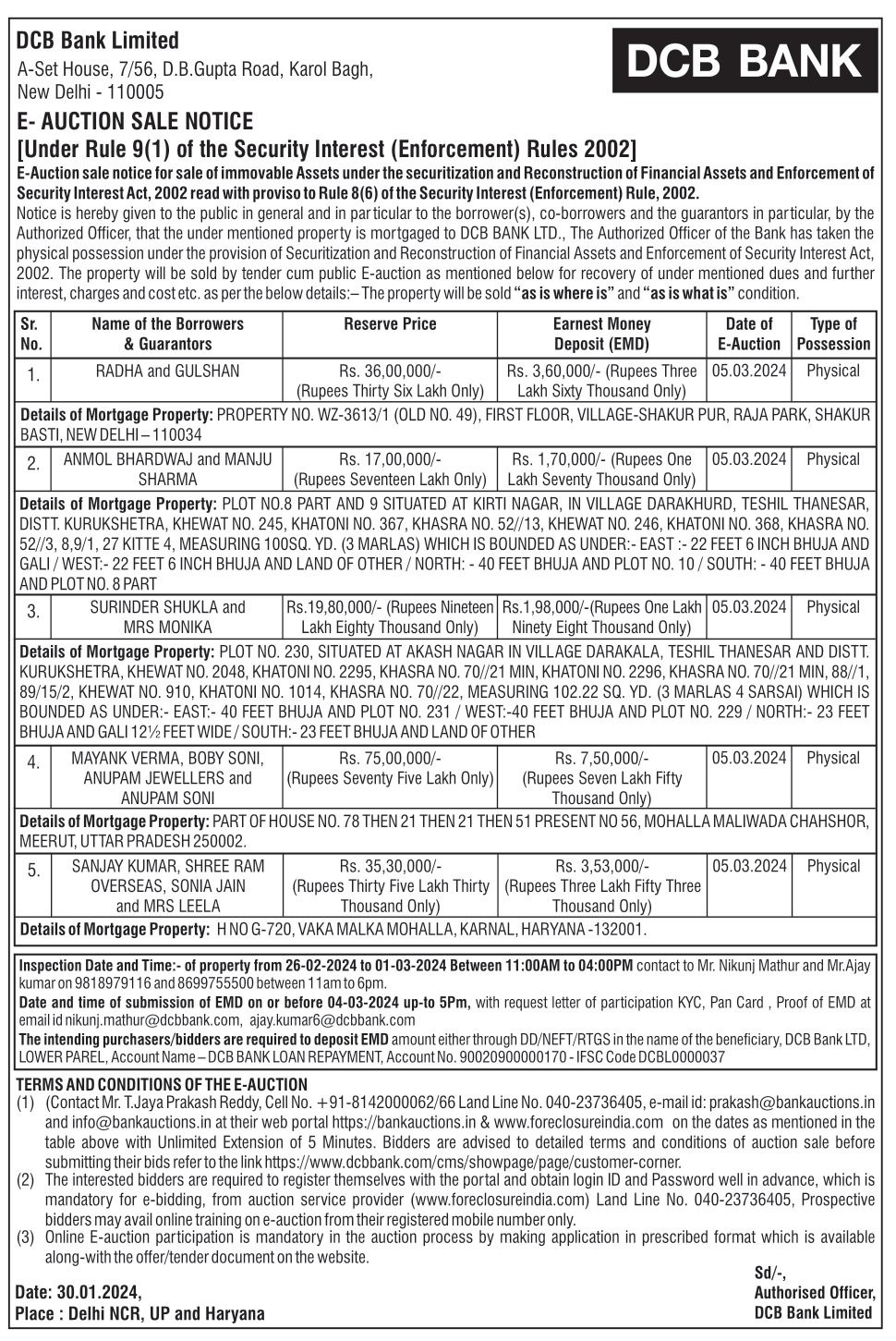 | Contact Details: | Contact the Authorized Officer : Mr. Nikunj Mathur and Mr.Ajay kumar on 9818979116 and 8699755500 |