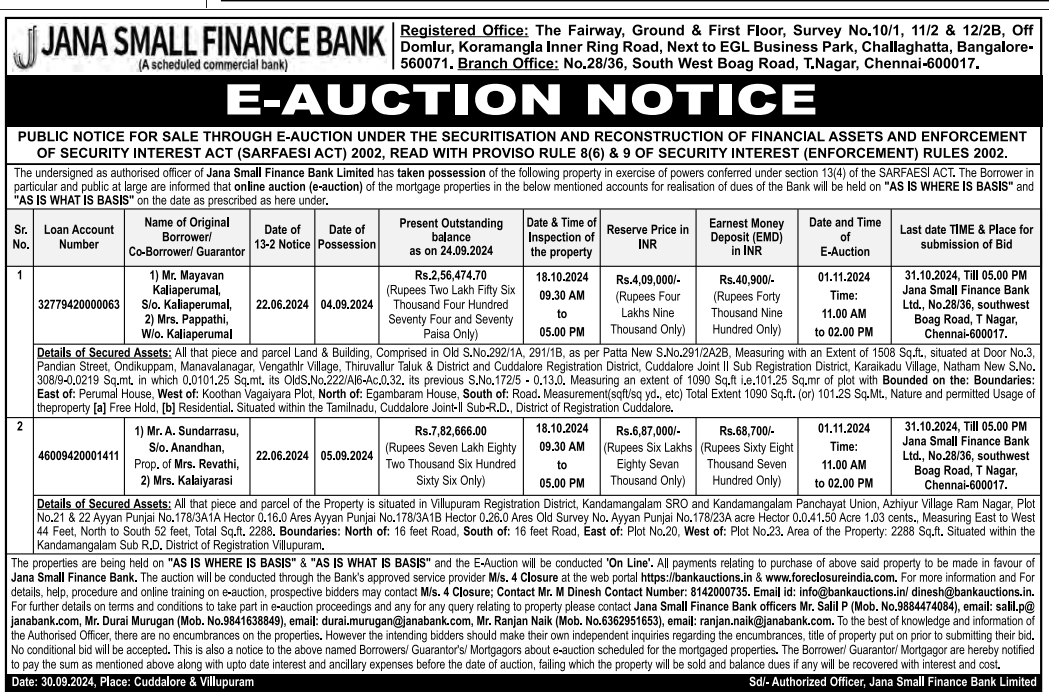 | Contact Details: | Contact The Authorized Officer: Mr. Salil P (Mob. No.9884474084), email: salil.p@ janabank.com, Mr. Durai Murugan (Mob. No.9841638849), email: durai.murugan@janabank.com, Mr. Ranjan Naik (Mob. No.6362951653), email: ranjan.naik@janabank.com |