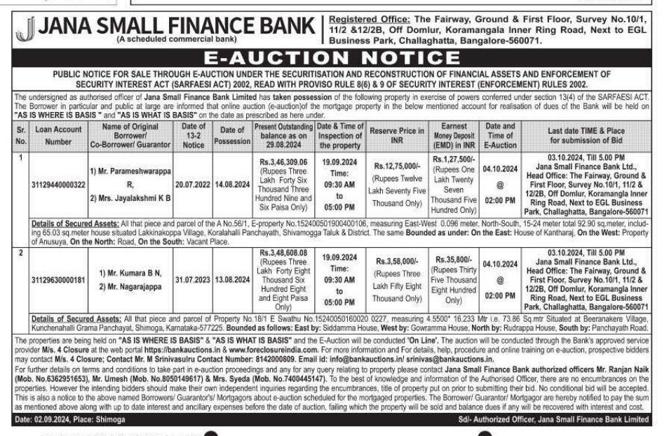 | Contact Details: | Contact The Authorized Officer: Mr. Ranjan Naik (Mob. No.6362951653), Mr. Umesh (Mob. No.8050149617) & Mrs. Syeda (Mob. No.7400445147) |
