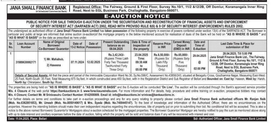 | Contact Details: | Contact The Authorized Officer : Mr . Ranjan Naik 6362951653, Mr. Umesh 8050149617, Mrs Syeda 7400445147 |
