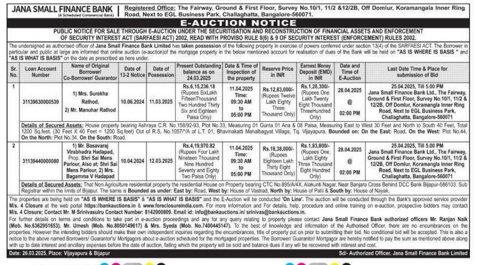 | Schedule of Property: | Details of Secured Assets: House property bearing Ashraya C.R. No 158/92-93 Plot No.33. Measuring 01 Gunta 01 Ana & 08 Paisa, Measuring East to West 30 Feet and North to South 40 Feet, Total 1200 Sq.feet, (30 Feet X 40 Feet 1200 Sq.feet) Out of R.S. No 1057/A of L.T. 01. Bhavinakatti Mahalbagyat Village, Tq. Vijayapura Bounded on: On the East: Road, On the West: Plot No.44, On the North: Plot No 34 On the South: Road |