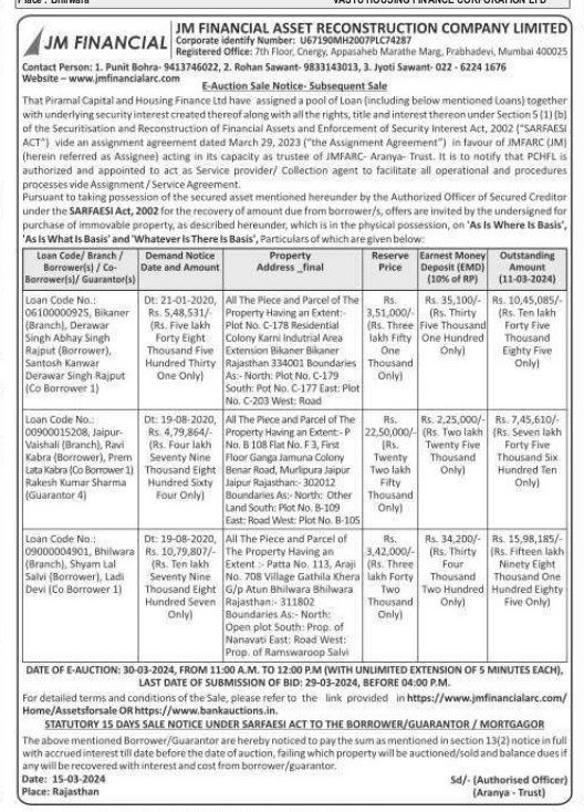| Start Date and Time of Auction: | 30-03-2024 11:00 am |