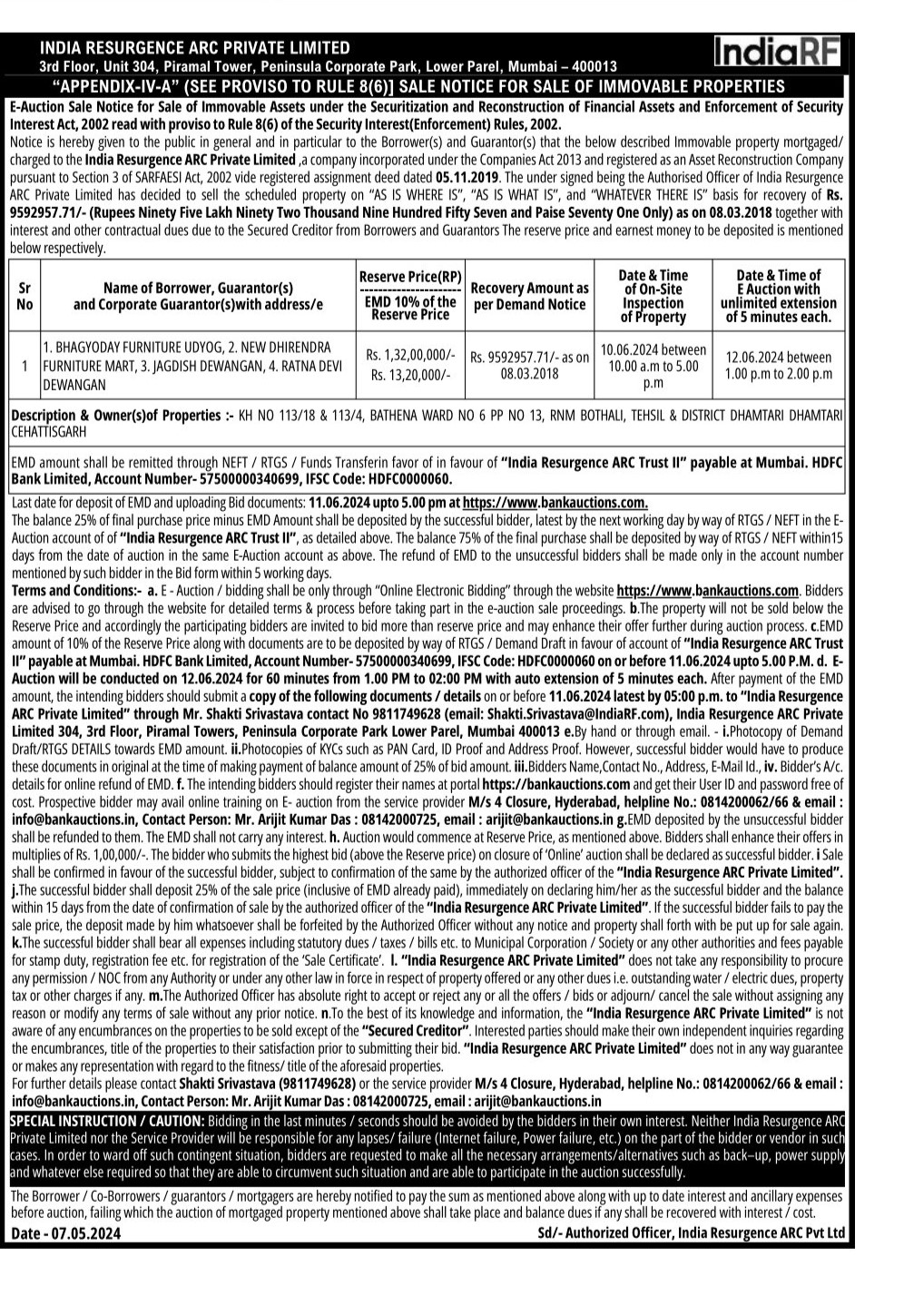 | Schedule of Property: | Description & Owner(S)Of Properties Kh No 113/18 & 113/4, Bathena Ward No 6 Pp No 13, Rnm Bothali, Tehsil & District Dhamtari Dhamtari Chattisgarh |
