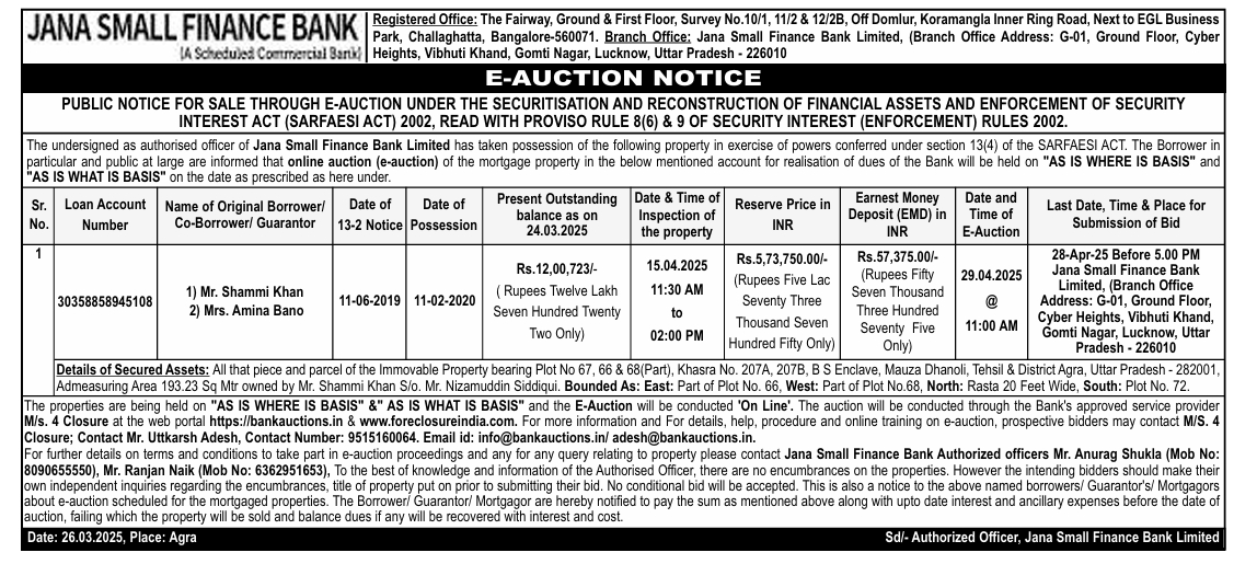 | Schedule of Property: | Details of Secured Assets: All that piece and parcel of the Immovable Property bearing Plot No 67, 66 & 68(Part), Khasra No. 207A, 207B, BS Enclave, Mauza Dhanoli, Tehsil & District Agra, Uttar Pradesh-282001, Admeasuring Area 193.23 Sq Mtr owned by Mr. Shammi Khan S/o. Mr. Nizamuddin Siddiqui. Bounded As: East: Part of Plot No. 66, West: Part of Plot No.68, North: Rasta 20 Feet Wide, South : Plot No. 72 |
